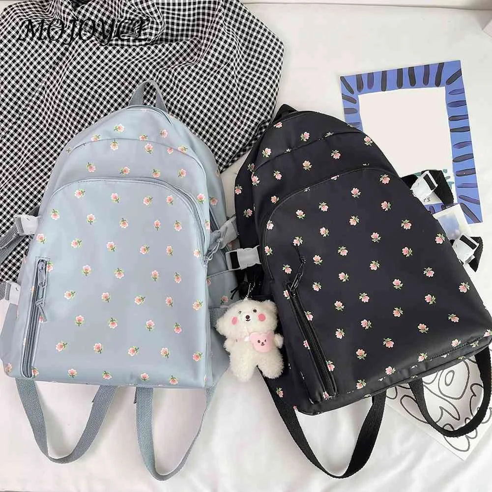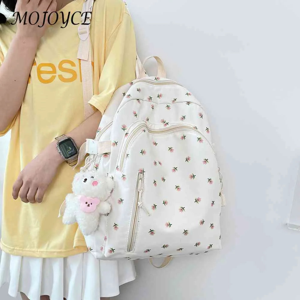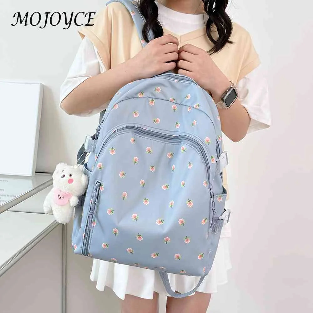 This floral backpack is made of durable nylon material, perfect for students. It features a preppy style with a large capacity to carry school books. The backpack comes with a pendant decor for added charm.