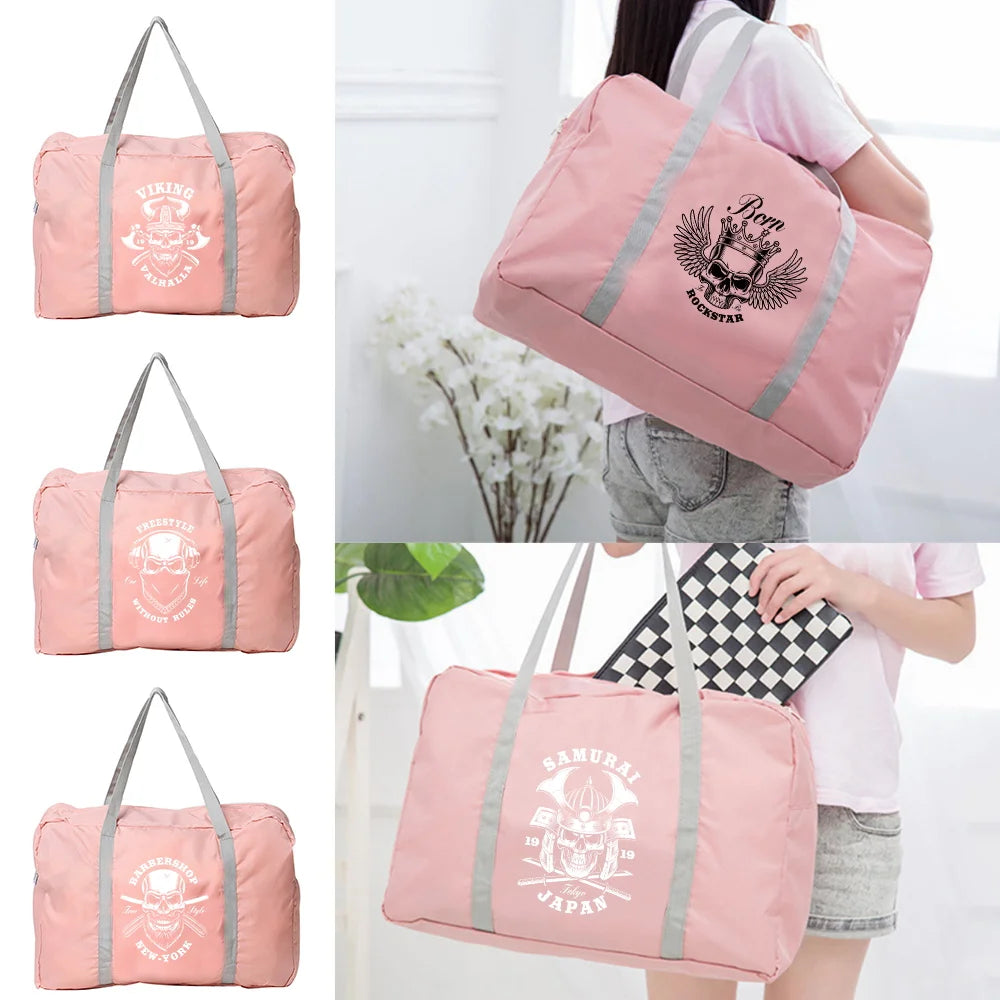 This foldable travel bag with skull series print is made of water-resistant nylon material. It has a large capacity and can be used as a luggage, shoulder pack, or handbag.