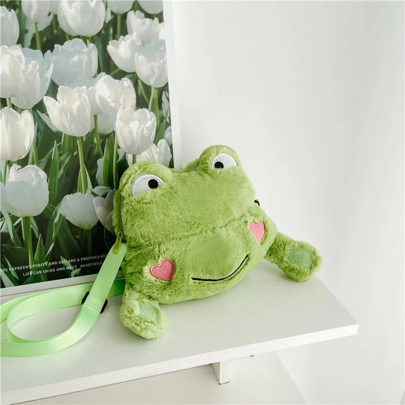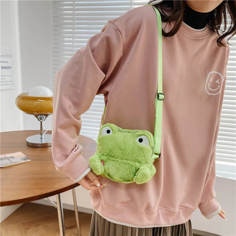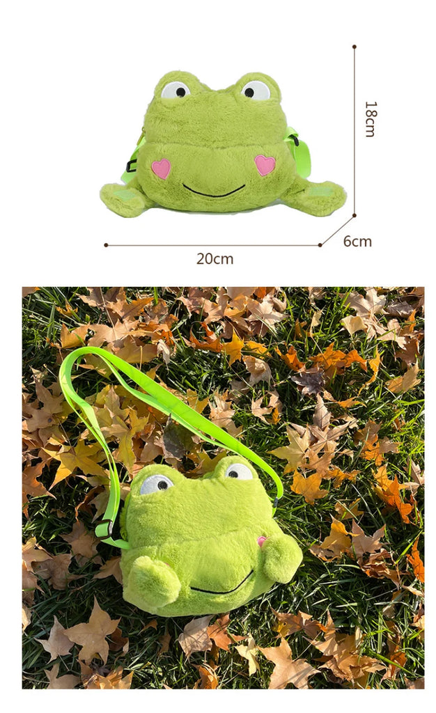 Adorable frog-shaped plush shoulder bag perfect for carrying small items. Ideal gift for autumn and winter seasons. Can be used for holding mobile phones, change, and more!