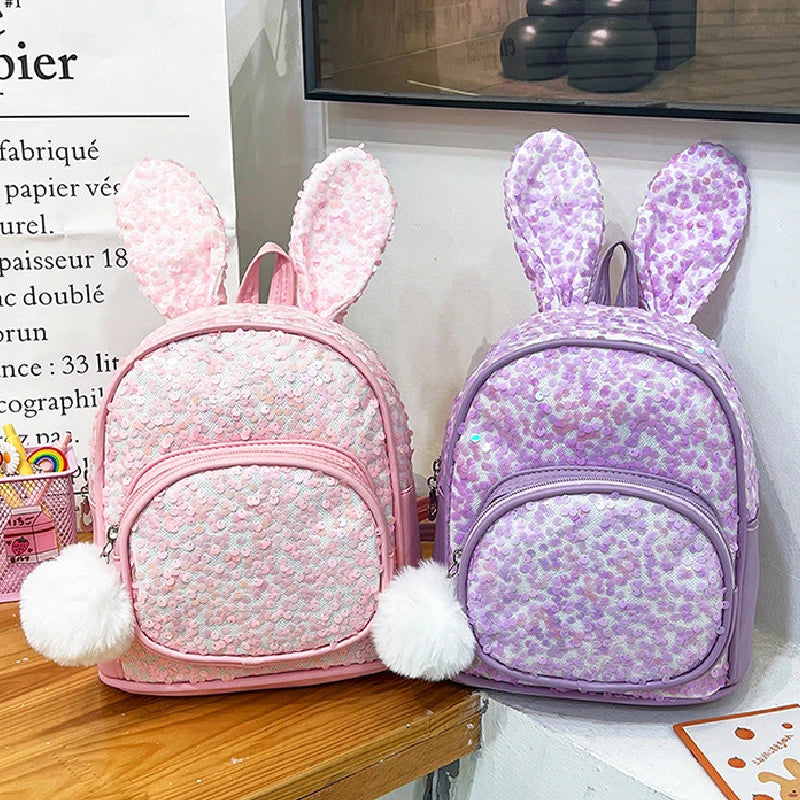Adorable mini backpack designed for kindergarten girls featuring sequins and rabbit ears. Perfect for school or outings. Zipper closure for easy access.