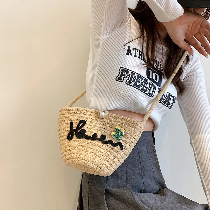 Girls Straw Beach Bag Woven Shoulder Bag Raffia Bucket Rattan Bags