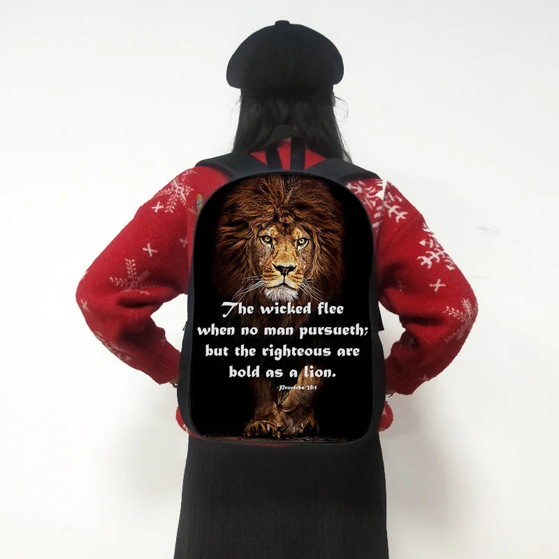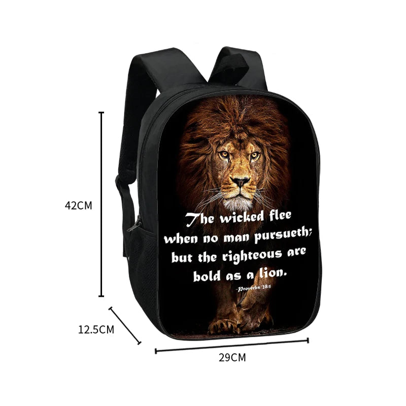 Inspire faith and carry your essentials in this lion backpack featuring a Bible verse. Perfect for travel, school, or work.