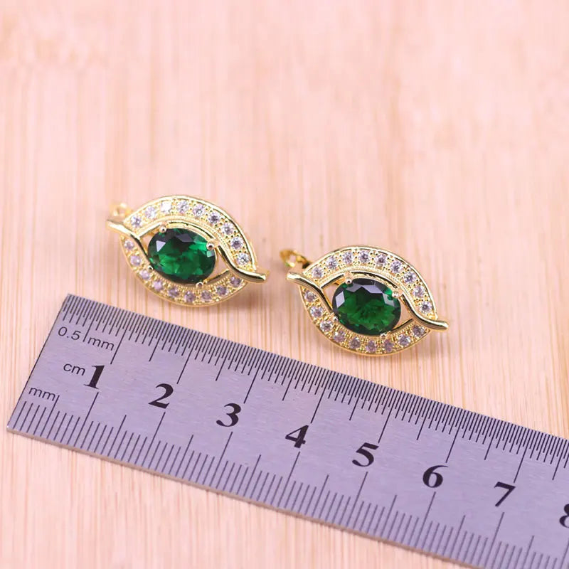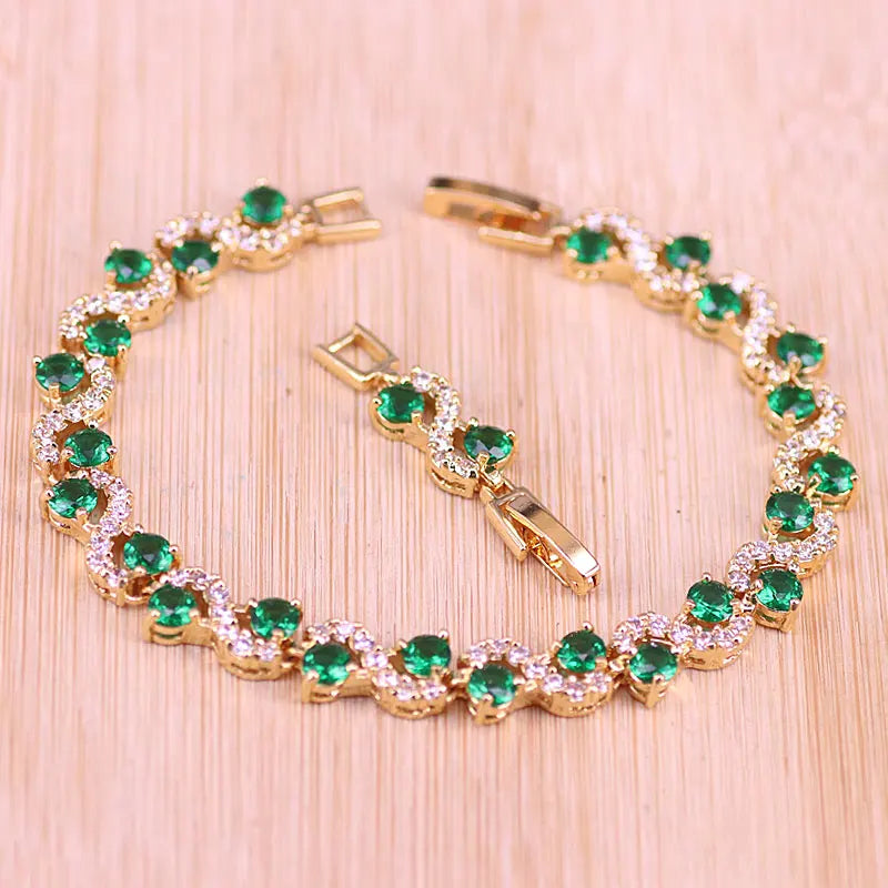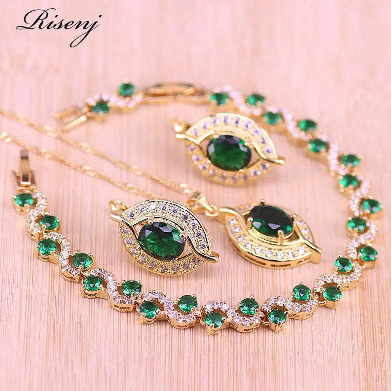 Green Stone Eye Square 18K Rose Jewelry Set With Bracelet