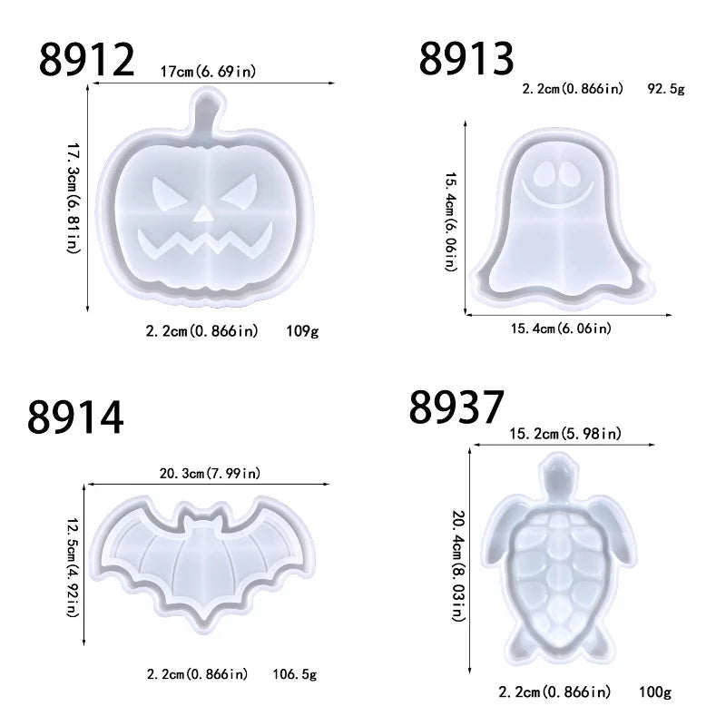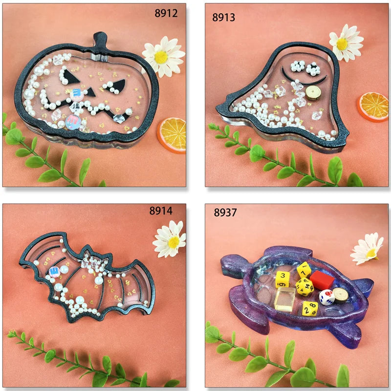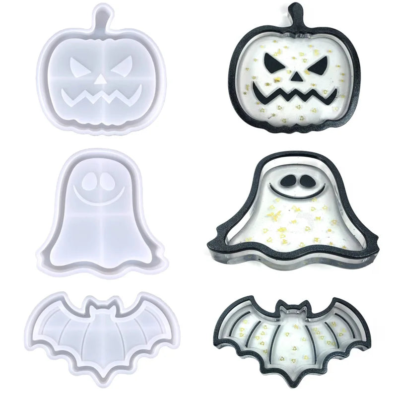 Create spooky Halloween decorations with this silicone mold perfect for making crystal trays. The mold features pumpkin, bat, and ghost shapes, ideal for making storage trays or jewelry. It's great for epoxy resin crafts and jewelry making.