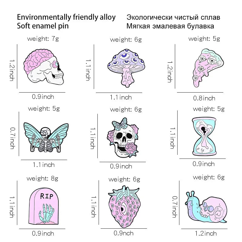 Add a spooky touch to your outfit with these cute Halloween enamel lapel pins featuring a pink tombstone, snail, strawberry, missing skull, and butterfly design. Perfect for backpacks and clothing accessories.