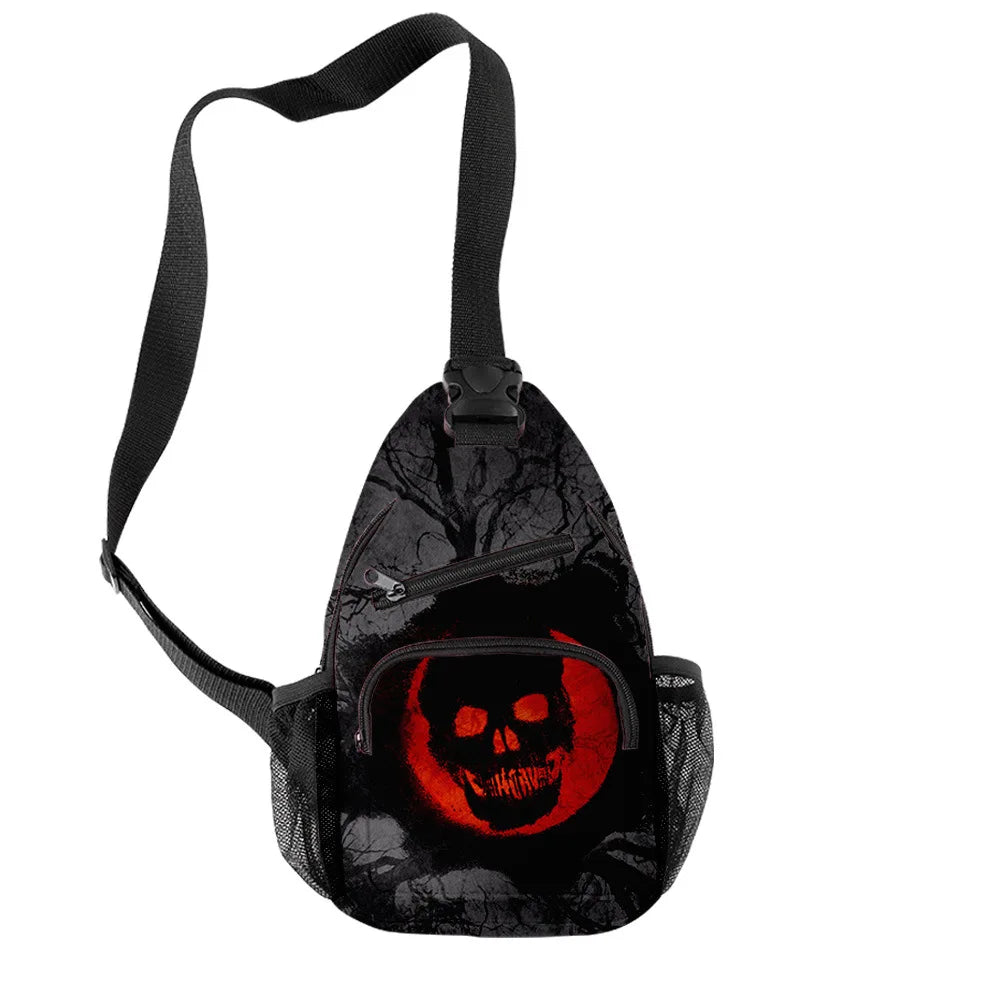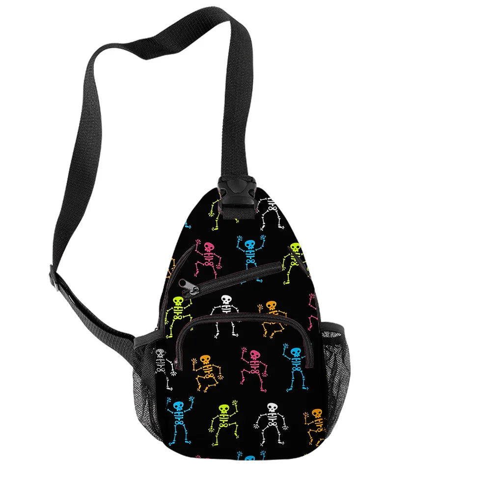 Unique and stylish Harajuku chest bag featuring a Halloween skeleton design with 3D print. Perfect for Halloween costumes or casual gothic streetwear.