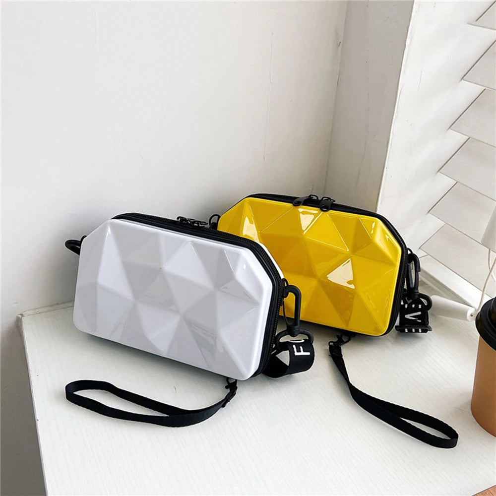 This stylish PC hard shell crossbody bag features a wide shoulder strap and is perfect for carrying your essentials. It also includes a small makeup bag for added convenience.