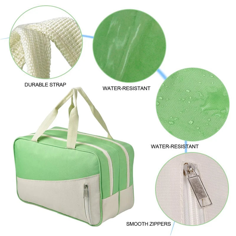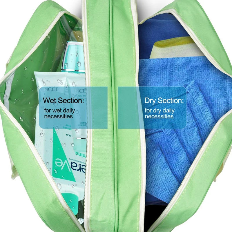 Stay organized while traveling with this waterproof bag featuring a wet and dry separator. Perfect for beach trips or carrying cosmetics.