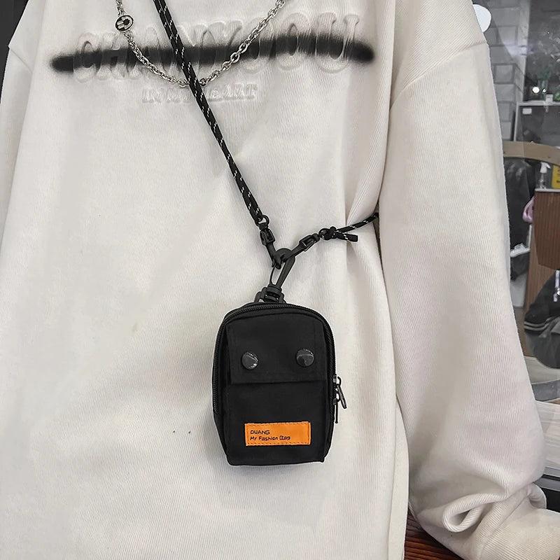 Stay stylish and organized with this hip hop mini shoulder bag. It features compartments for your coins, keys, cards, and headphones.