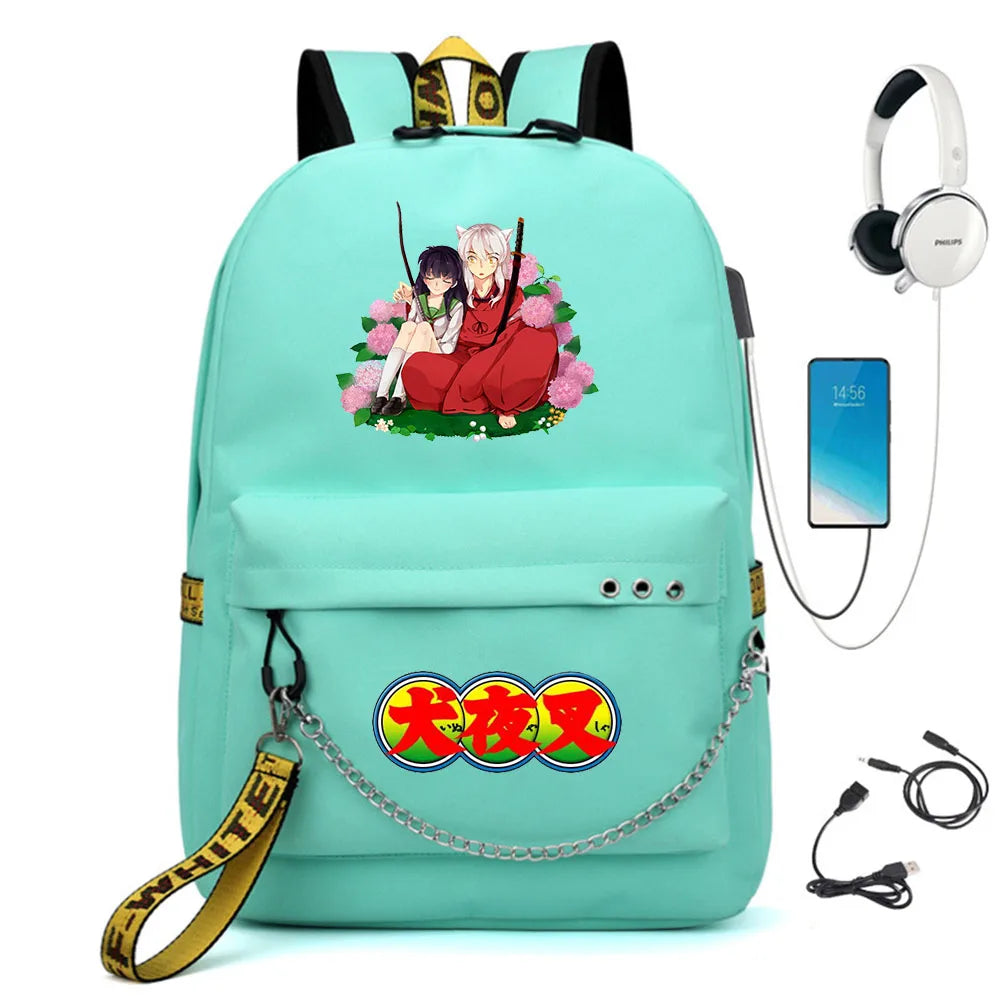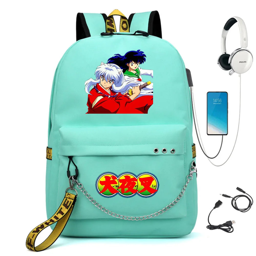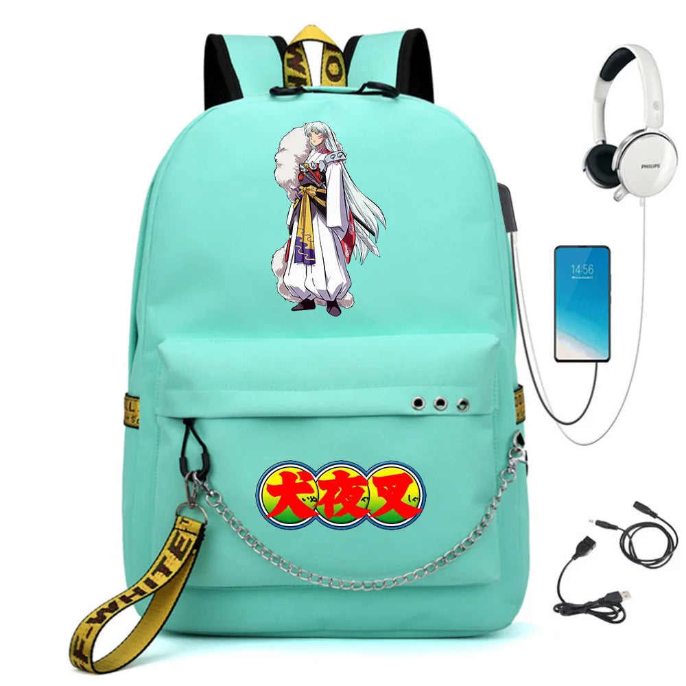 Inuyasha Nylon Backpack USB Charge Schoolbag Casual Student Teenager Knapsack