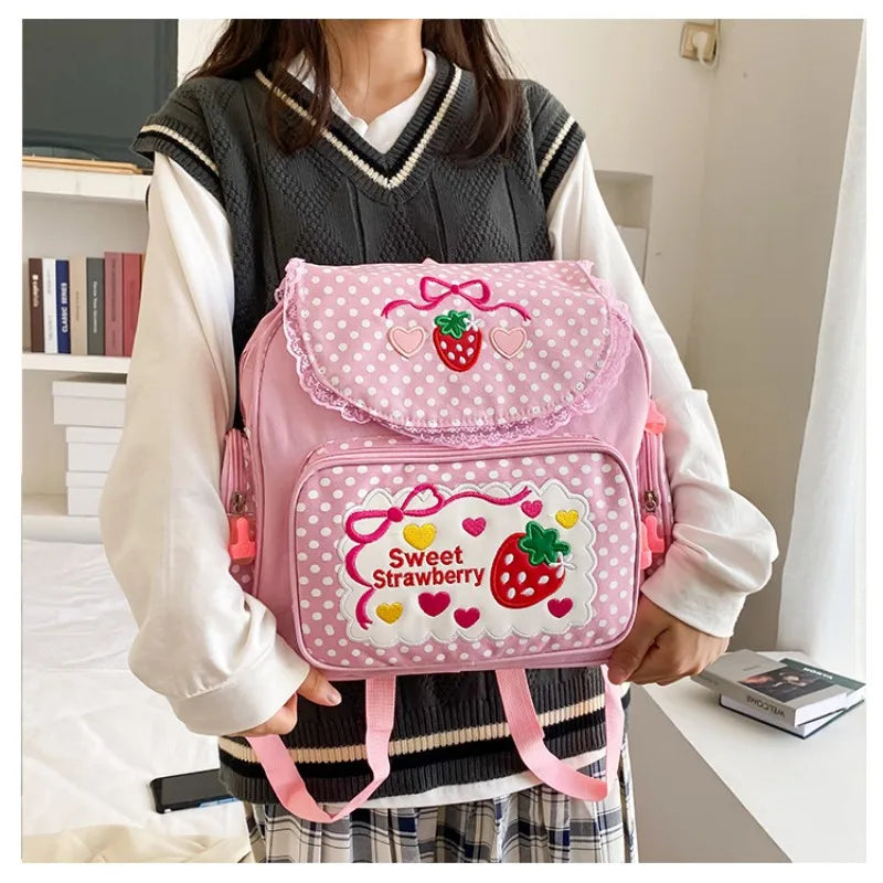 This sweet and lovely backpack is perfect for schoolgirls with its cute fruit strawberry embroidery and lace design. A must-have for fashionable students!