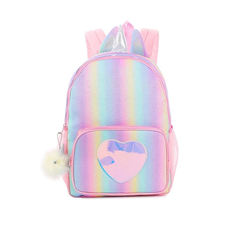 Adorable kids backpack featuring a cartoon glitter heart design. Equipped with a chest strap for added comfort and security. Perfect for school or everyday use.