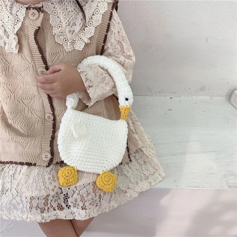 This adorable handbag is perfect for children to carry their essentials. The knit design features a cute cartoon goose, making it a fun accessory for both boys and girls.