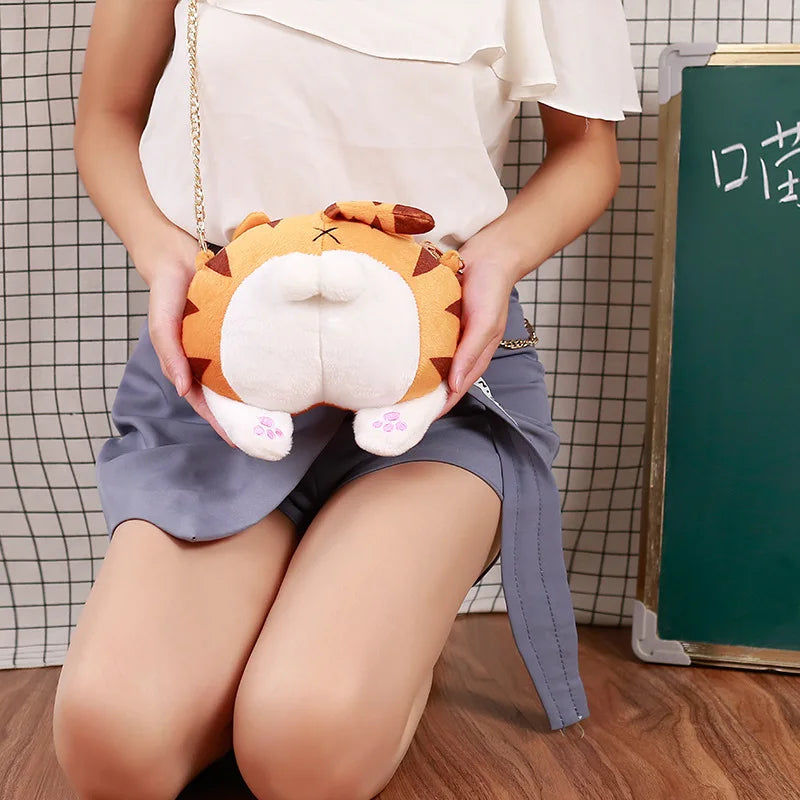 Adorable cat butt style messenger bag that is perfect for girls who love a cute and unique accessory. This bag is made of soft stuffed toy material with a kitty tail and chain shoulder strap.