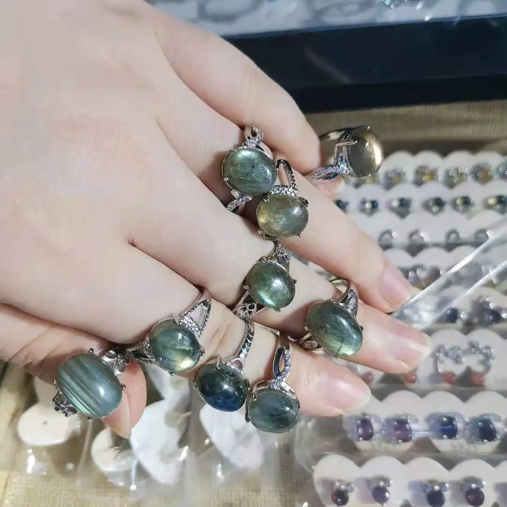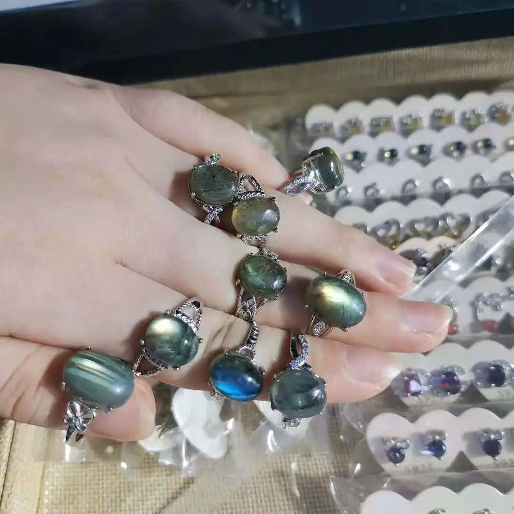 This natural Labradorite Ring features a Grey Moonstone inlay depicting a Moonlit night scene. Made with s925 Silver, it's a unique piece of organic gemstone jewelry.