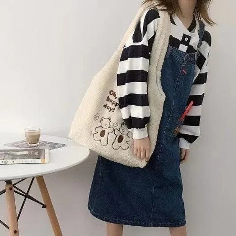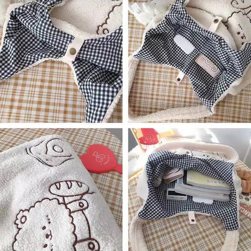 Lambswool Shoulder Bag Large Capacity Cartoon Embroidery Preppy Style