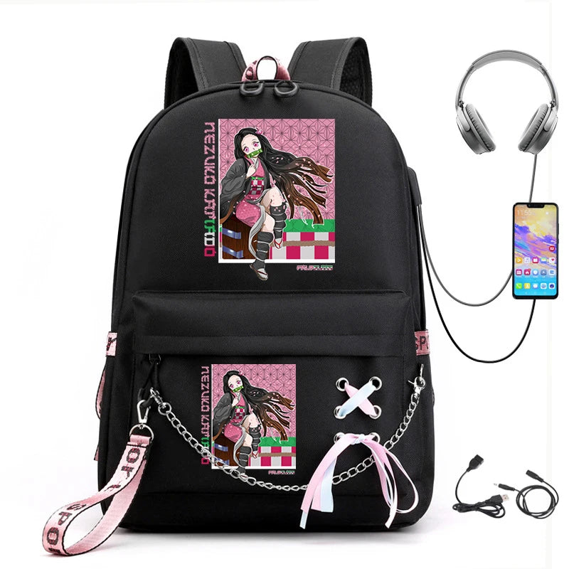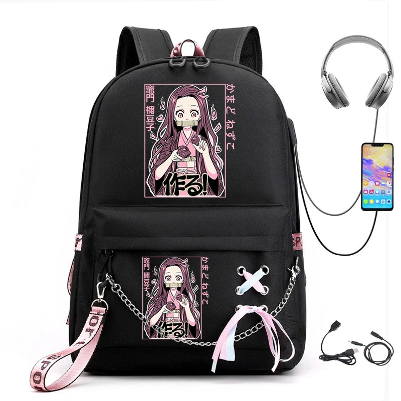 This backpack features a Demon Slayer anime design, perfect for students and casual use. It offers a large capacity with multiple compartments for convenient storage.