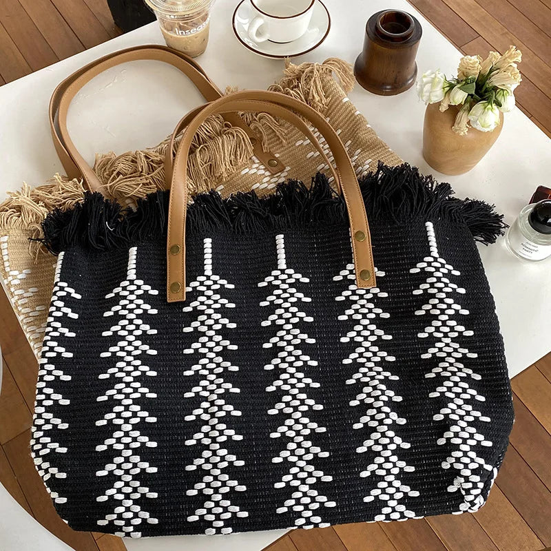 This spacious shoulder bag is perfect for beach outings, shopping, or any casual day out. It features a woven knitting design that adds a touch of style to your look.