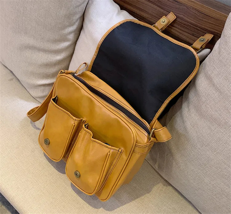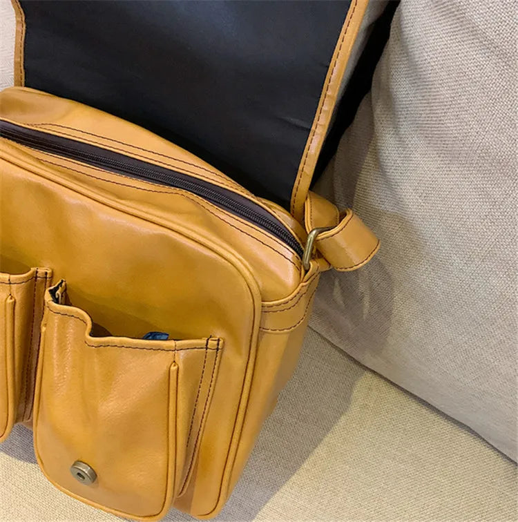 Description:This large capacity messenger bag is perfect for carrying all your essentials. Made from yellow oilskin material, it has a vintage look.Features: Large capacity messenger bag Vintage shoulder bag design Yellow oilskin material Adjustable cross-body strap Multiple compartments for organization This product may be available in additional colours and sizes....