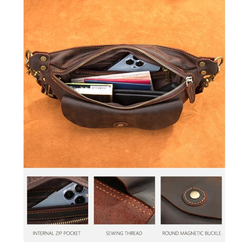 This leather fanny pack is versatile for hiking, running, traveling, camping, and more. It can be worn around the waist or as a shoulder bag.