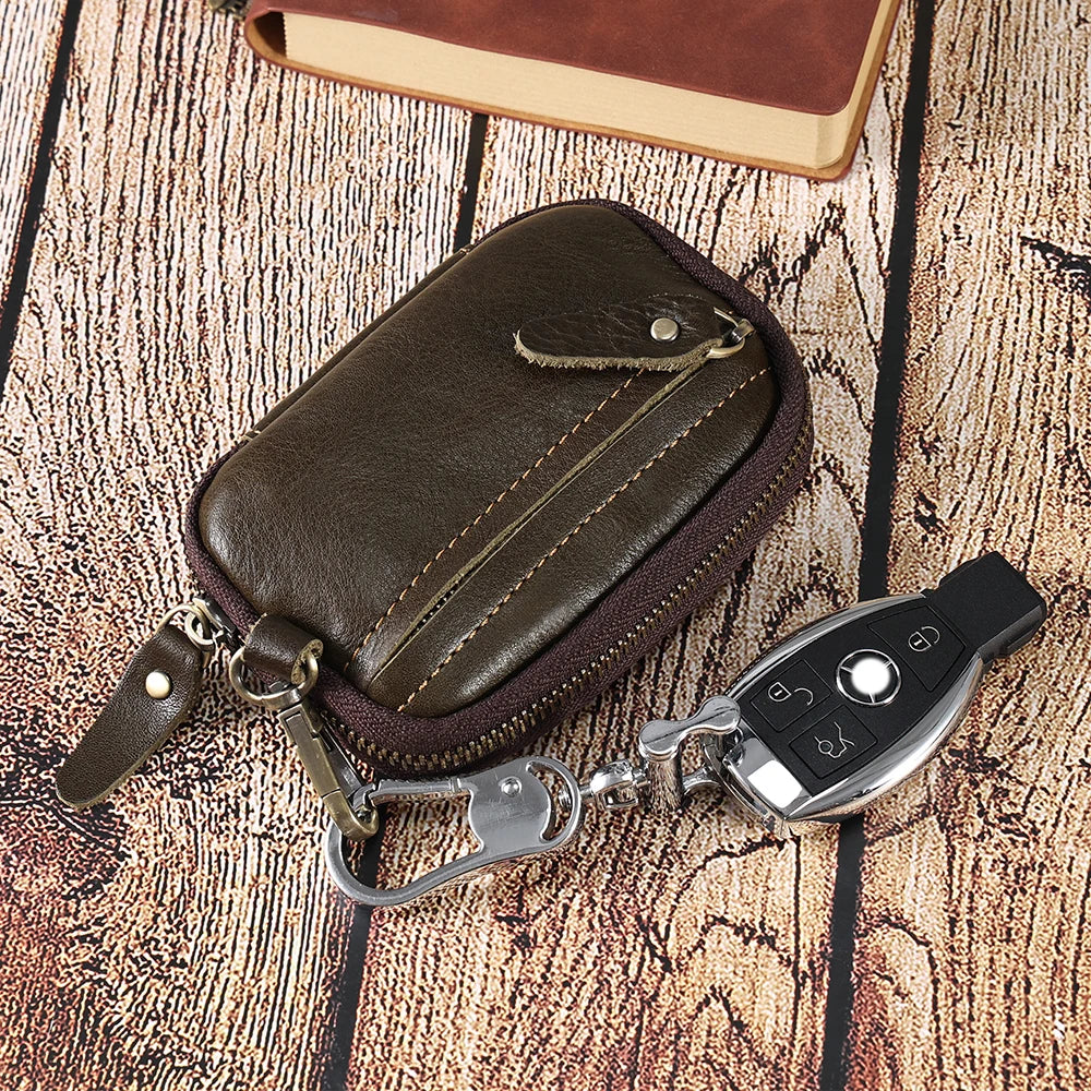 Keep your keys organized and secure with this leather key wallet. It features a zipper for added security and can hold multiple keys.