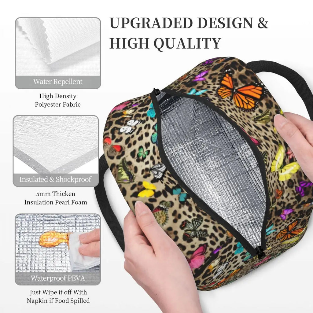Get ready for lunch with this stylish Leopard Butterfly Lunch Bag featuring a striking animal print design. Perfect for school or work, this lunch tote will keep your food fresh and organized.