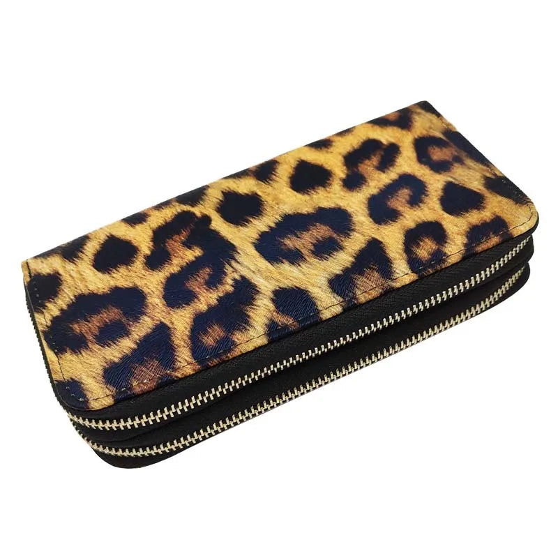 Stay stylish with this double zipper clutch bag featuring a trendy leopard pattern design. It offers a large capacity for your essentials and includes a mobile phone compartment. Perfect for European and American fashion enthusiasts.