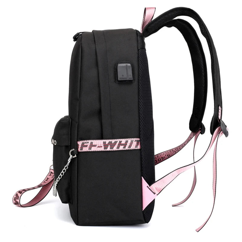 This canvas backpack with USB charge is perfect for teenage girls. It features a stylish letters print design and comes with ribbons for added charm. Ideal for school, travel, or everyday use.