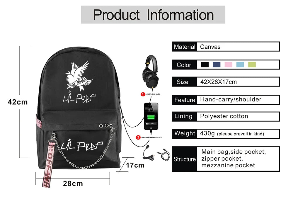 Lil Peep School Backpack Oxford Waterproof USB Travel Bag