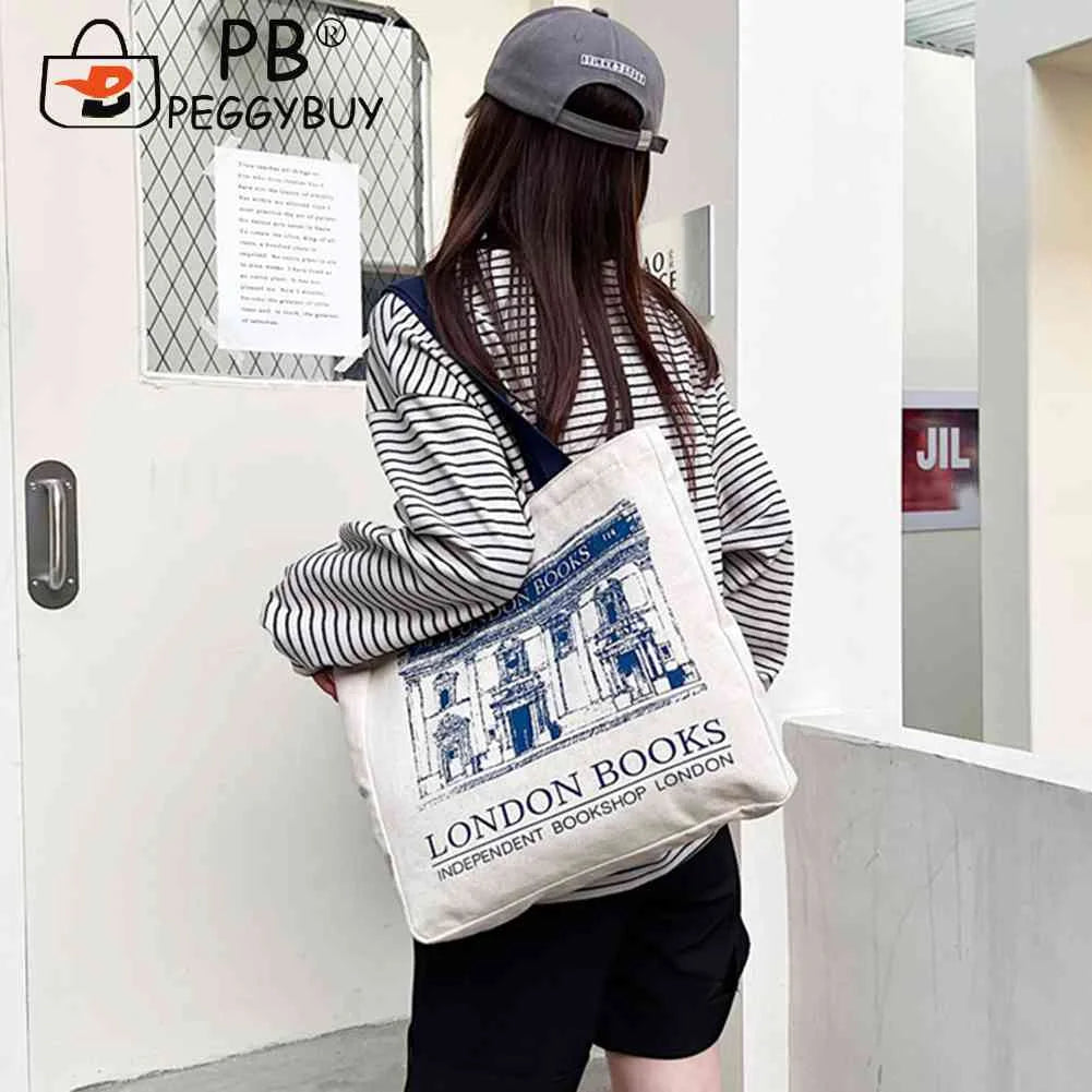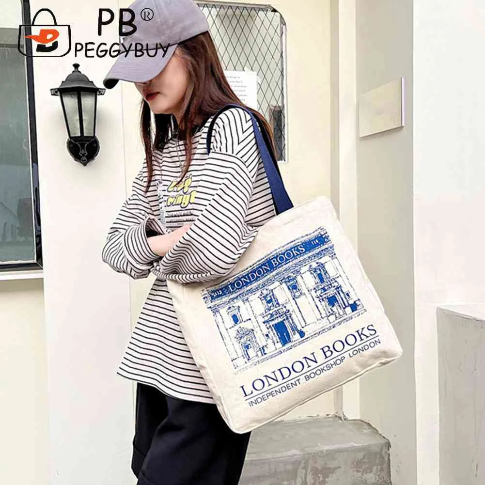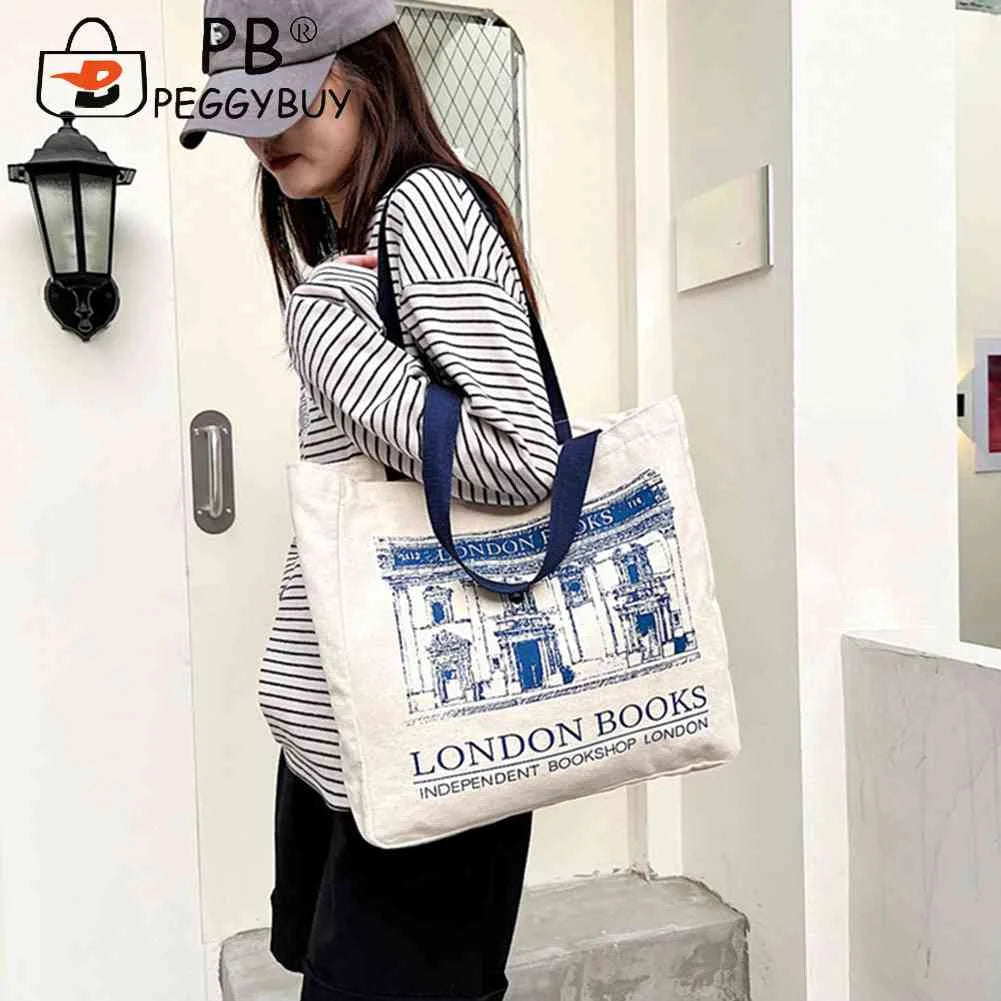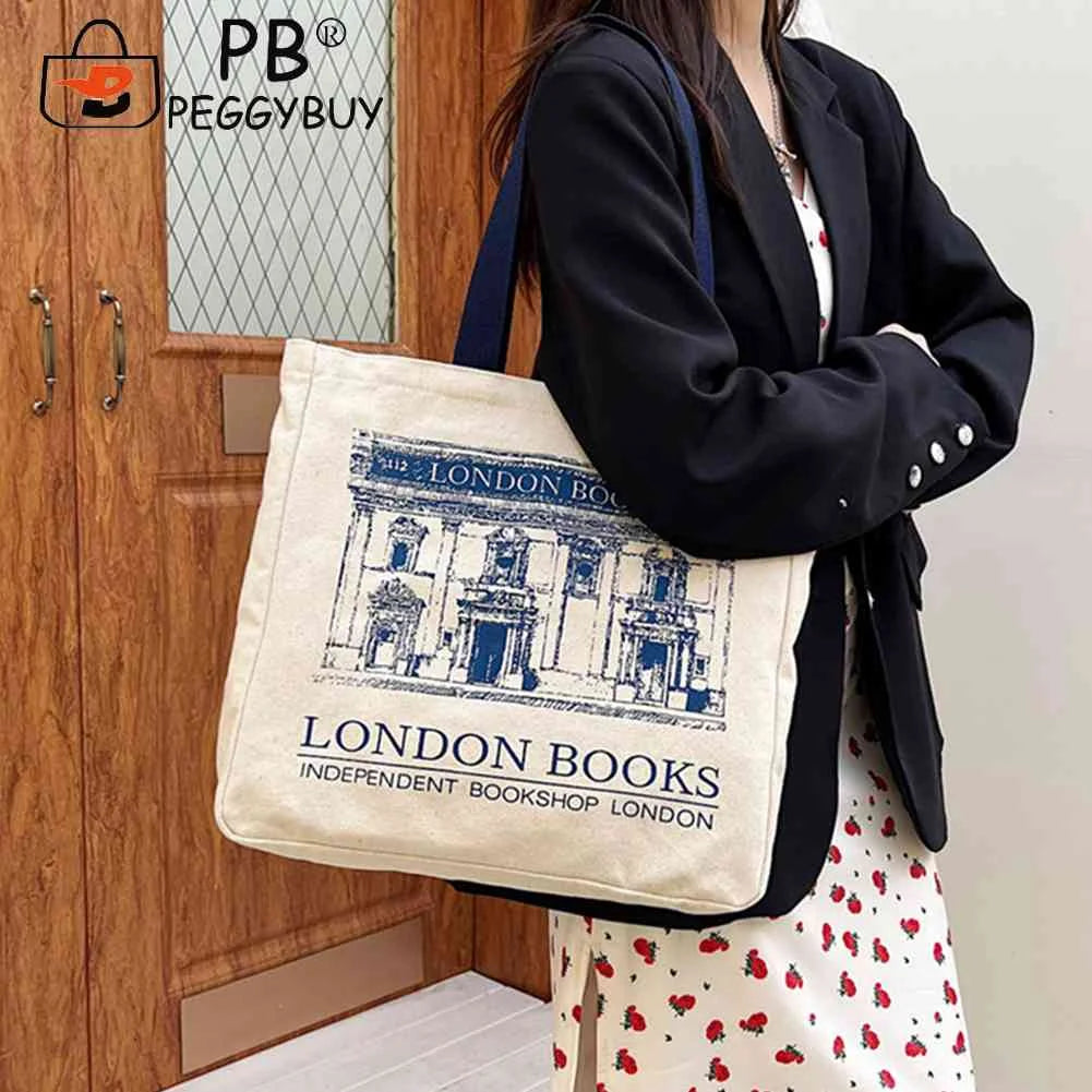 Carry your essentials in style with this chic canvas top-handle bag featuring a London bookshop print. Perfect for travel, shopping, and office work.