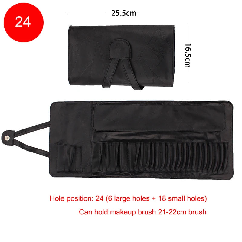Keep your makeup brushes organized and protected with this functional cosmetics case. Perfect for traveling, this pouch can hold up to 24 brushes and features a rolling design for easy access.