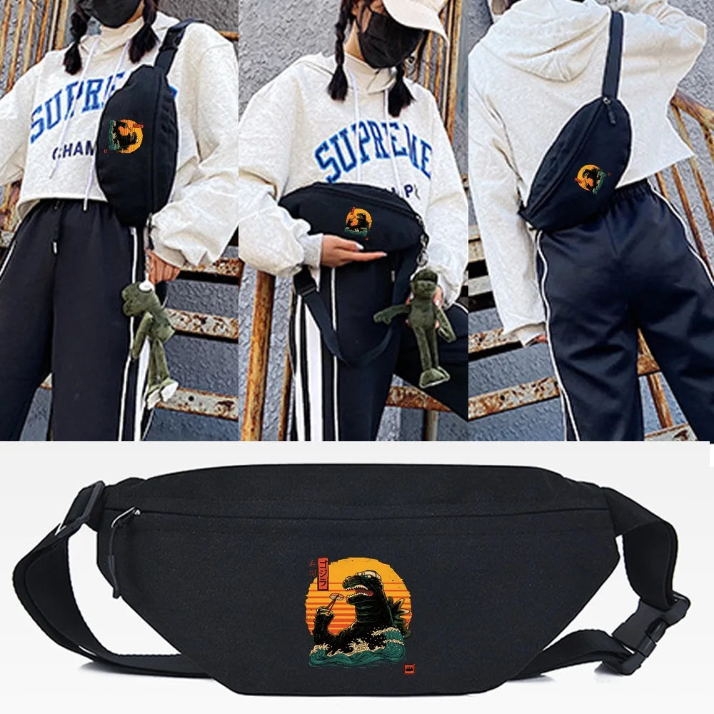 This versatile bag can be worn as a crossbody, hip hop street style shoulder bag, waist bag, or chest bag. It features a cool monster print design.
