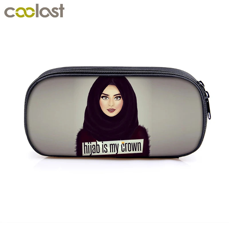 This cosmetic case features a Muslim woman in hijab design, perfect for storing makeup essentials. Ideal for school or travel.