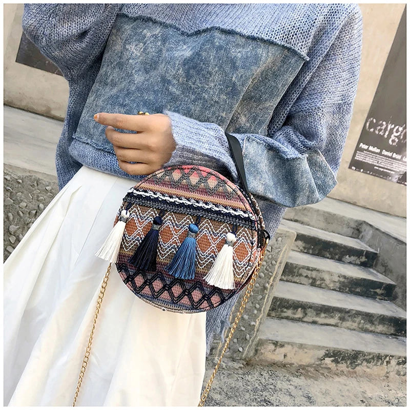 Stay trendy with this fashionable small round bag for girls, featuring a stylish handheld chain design.