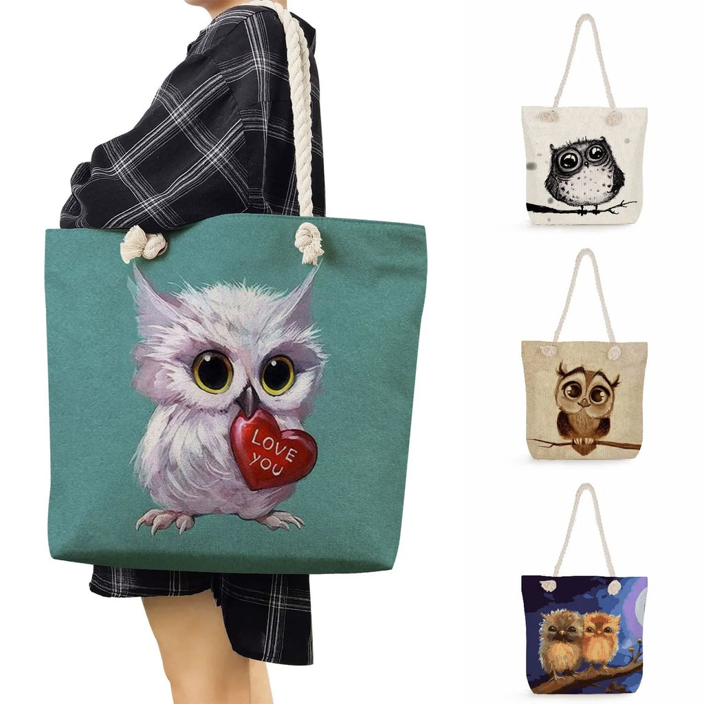 Owl Print Handbags Casual Cartoon Birds Lady Big Capacity Reusable Shopping Bags