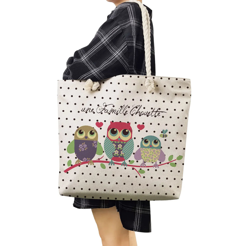 Owl Print Linen Beach Shoulder Bag Large Capacity Shopping Handbag