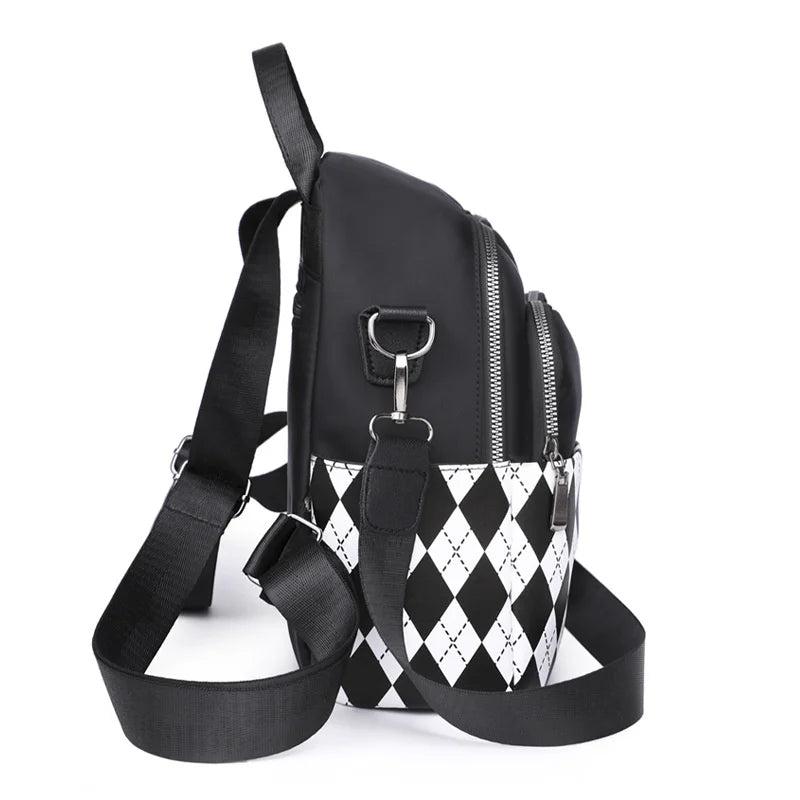 Stay stylish and organized with this Oxford woman backpack. Perfect for high school or casual travel, featuring a lattice design and contrasting colors.