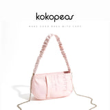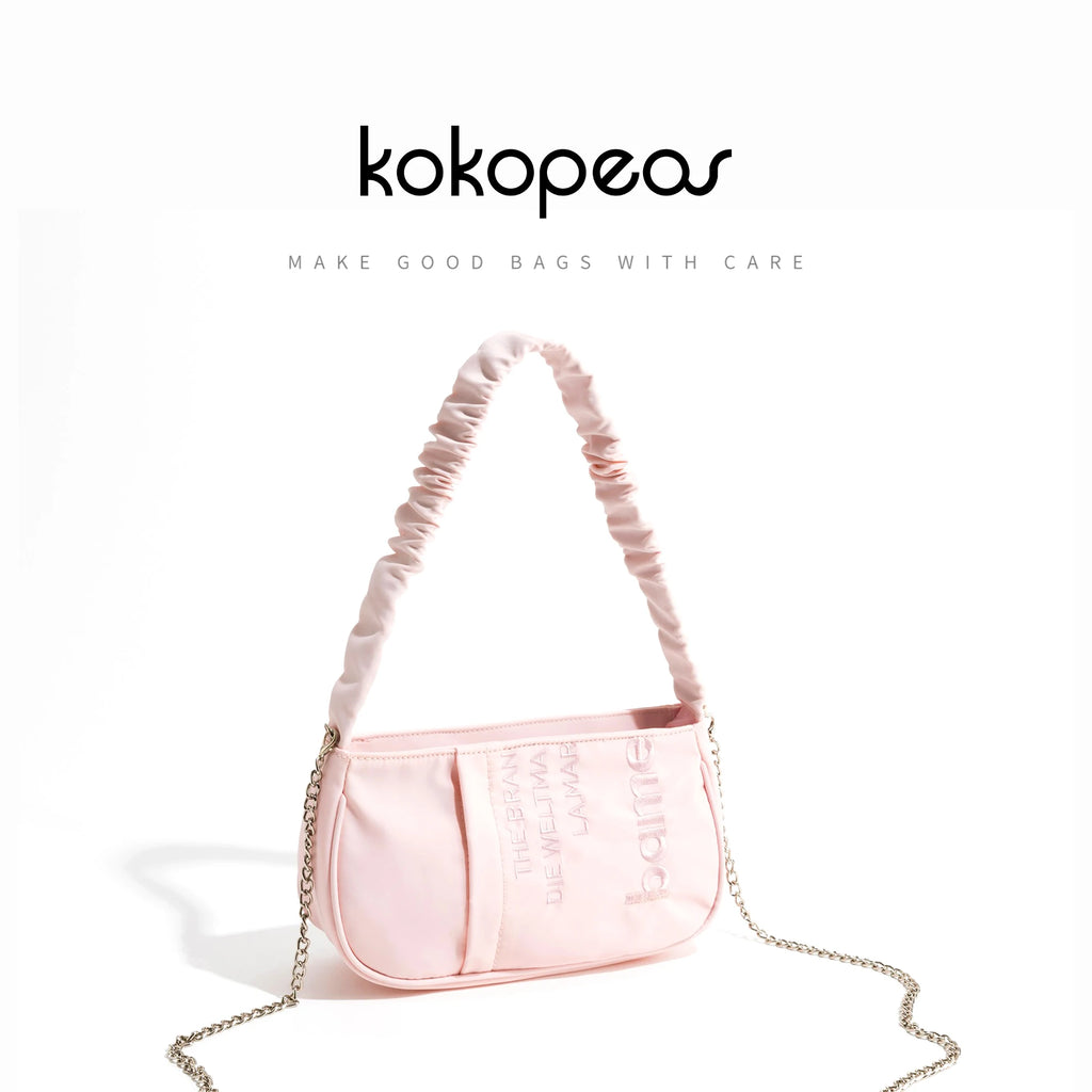 This stylish pink half moon shoulder bag features a letter 'M' embroidery design and ruched handle. The perfect small crossbody purse for everyday use.