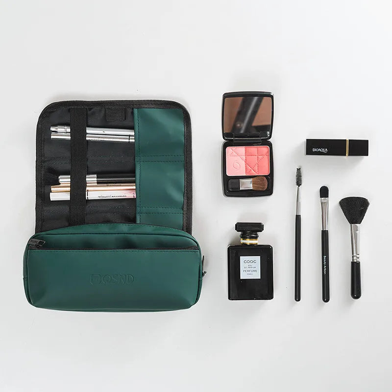 This small square bag is designed for efficient organization of your cosmetics and toiletries during travel. It features multiple layers for easy separation and access to your items.