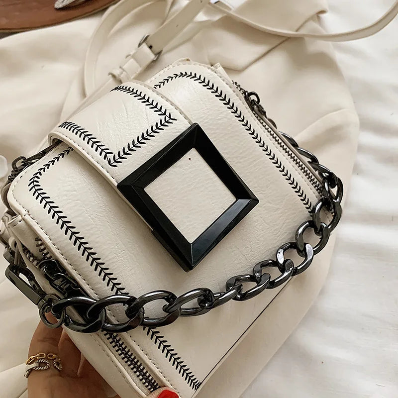 This small delicate bucket bag is made of high-quality PU leather with a retro design. It features chains and a hasp closure for added style.