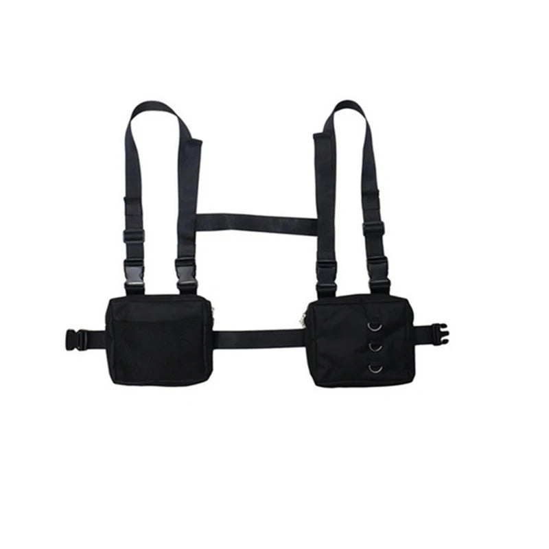 This unisex outdoor functional vest bag features two pockets and a harness chest rig design, perfect for hip-hop enthusiasts and streetwear aficionados.