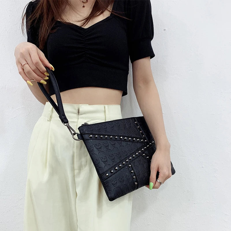 Stay edgy with this punk woman clutch bag featuring fashionable skull design. It has a large capacity, shoulder strap, and retro rivet details for a bold look.