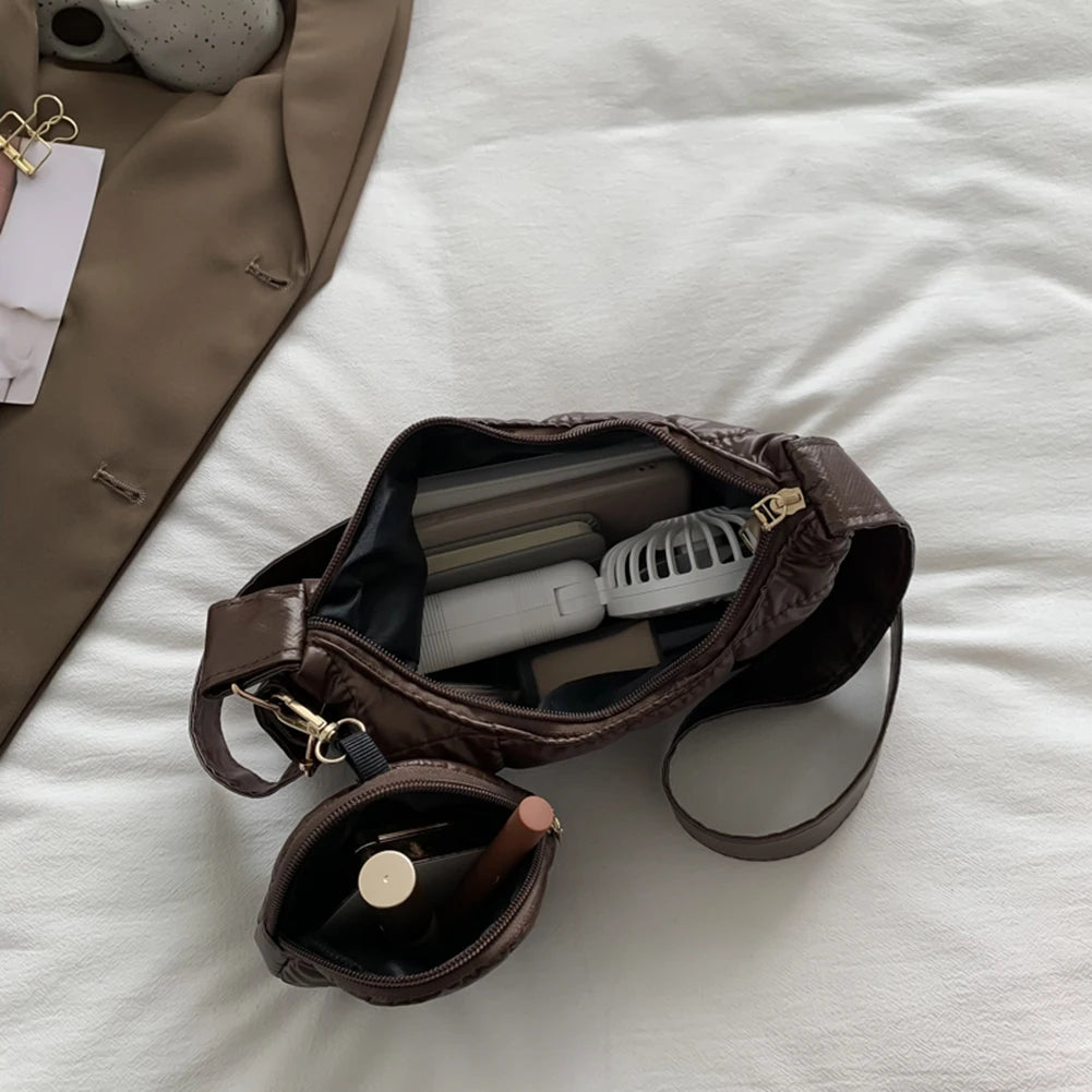 Stay stylish and cozy this autumn and winter with this quilted cotton-padded crossbody bag. Featuring a casual design, adjustable strap, and a small round purse, this bag is perfect for everyday use.