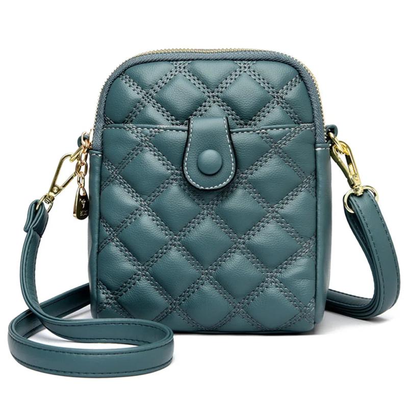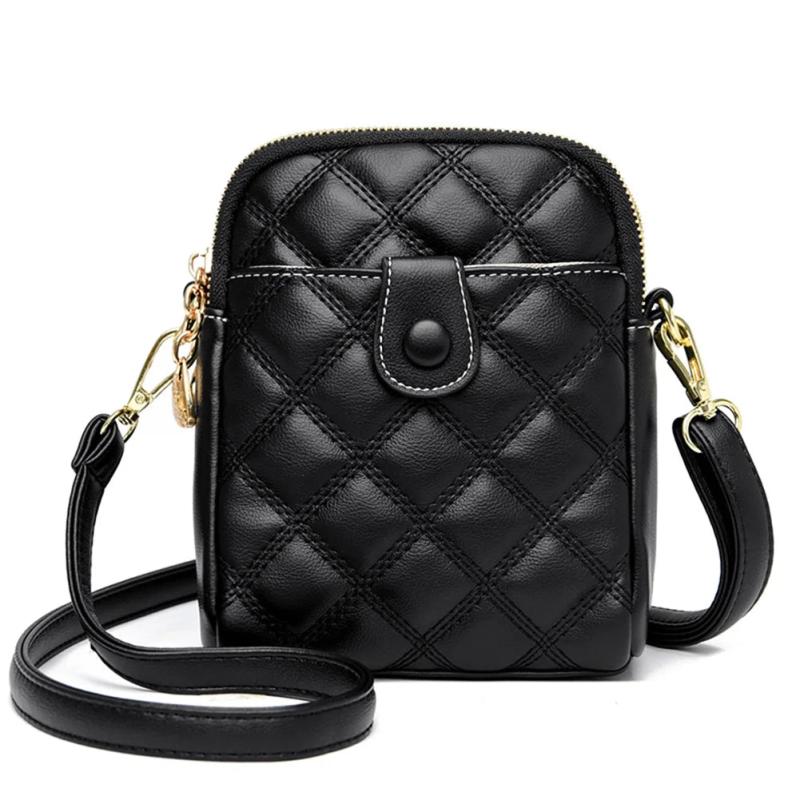 This small and portable cell phone purse is a stylish accessory for women. It features a quilted rhombus design and an adjustable strap for convenience.