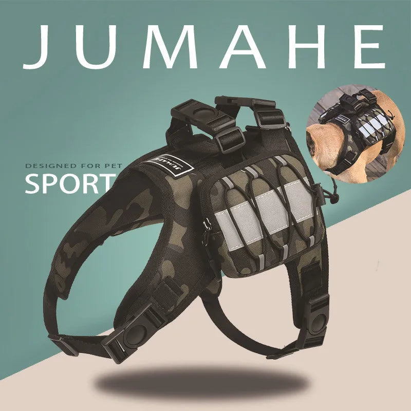 This tactical pet backpack harness is ideal for small dogs, offering a breathable and durable design. It features reflective material for safety.