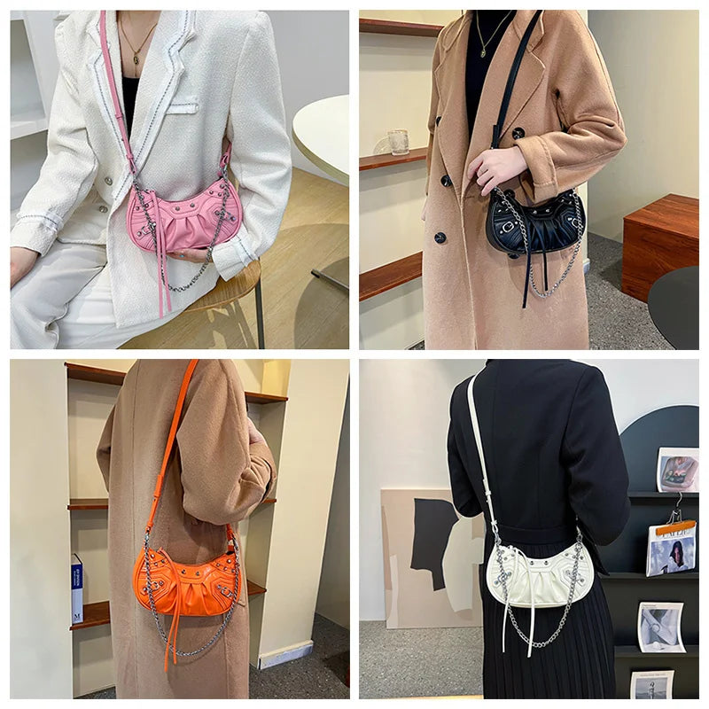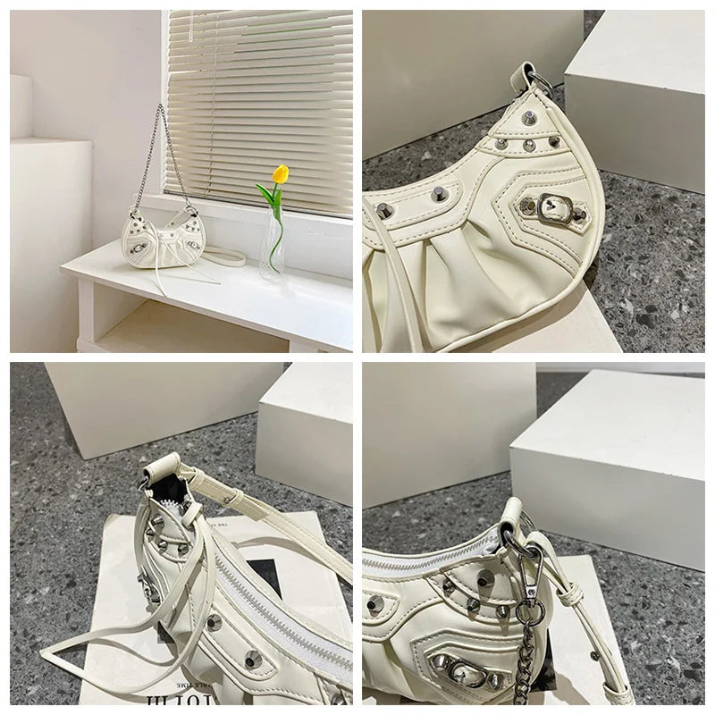 Stay stylish and edgy with this winter woman bag featuring rivet details and a modern half moon hobo design. Comes with a matching purse for added convenience. Perfect for casual outings with a touch of punk flair.