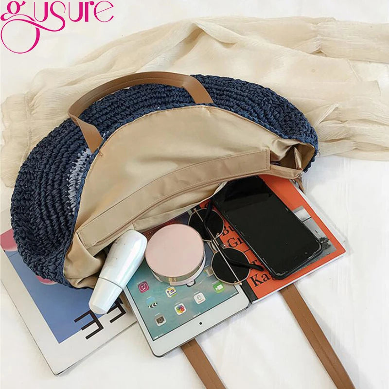 Embrace bohemian vibes with this stylish round straw beach bag. Perfect for vacations or casual outings, this bag is a must-have for any beach lover.