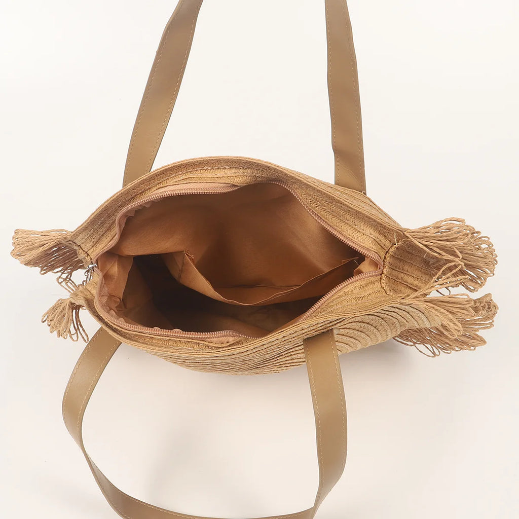 Bohemian style meets summer vibes with this round straw beach bag. Perfect for your vacation getaway or casual outings.