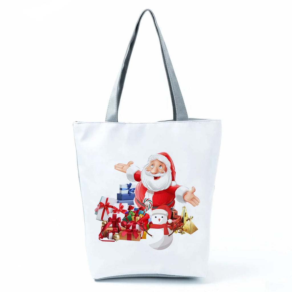 This festive handbag features a cute Santa Claus and snowman print, perfect for the holiday season. It's a high-capacity shoulder bag ideal for shopping or gifting.