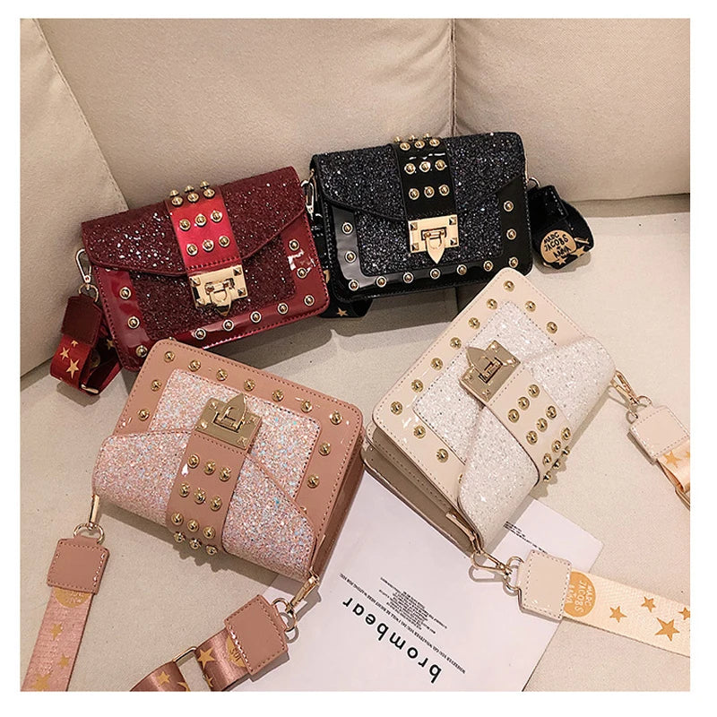 Add a touch of glamour to your outfit with this stylish small square bag featuring sequin rivets and a wide shoulder strap.
